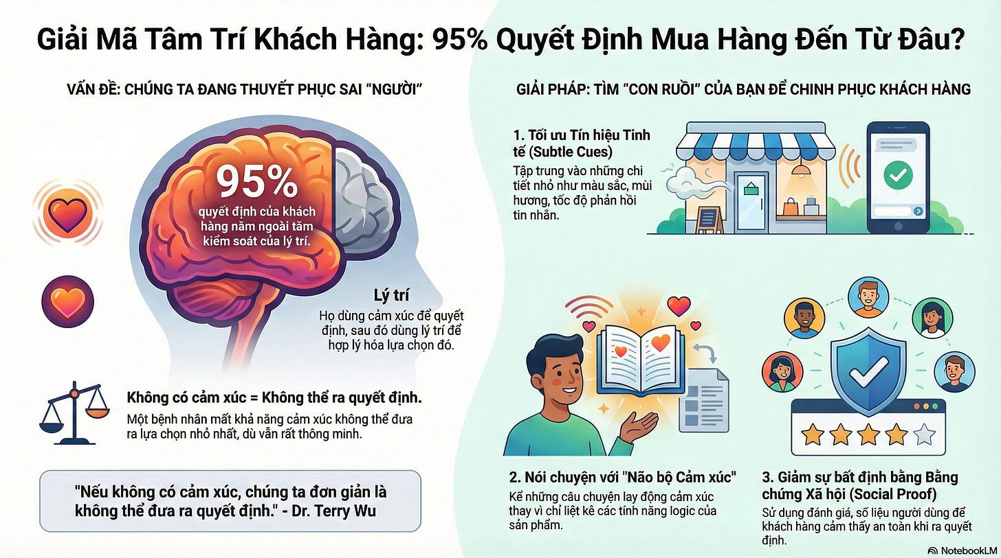 Bạn không hiểu tại sao khách hàng lại phi logic như vậy, và muốn biết họ thực sự nghĩ gì để nói đúng thứ họ cần. Bạn thấy điều đó thật khó làm, cho đến khi bạn gặp được Terry Wu. Trong toàn bộ clip, ông nhấn mạnh một thông điệp thay đổi hoàn toàn cuộc chơi: 95% quyết định của khách hàng nằm ngoài tầm kiểm soát của lý trí.