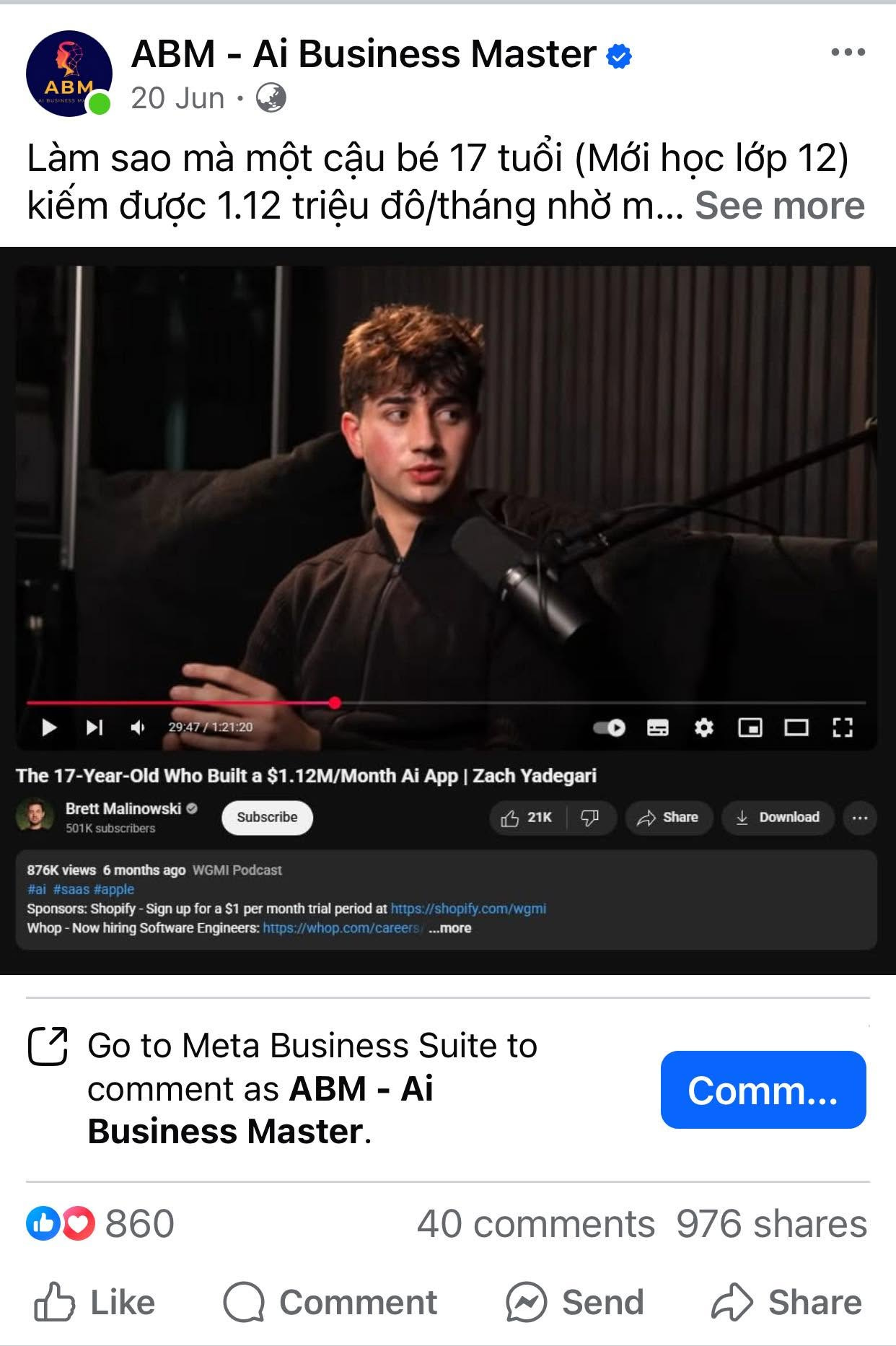 - Bài viết viral lần 2 - Chia sẻ dài, cậu bé kiếm tiền từ một app AI. (Đạt 241k views - 860 like - 975 share) → Phù hợp trend về AI.